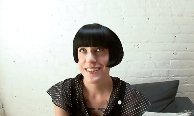This pinkish haired slut in polka dot dress loves fucking on camera