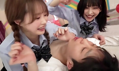 The old perverted teacher takes two pretty college girls to a hotel, one is timid and the other is a slut