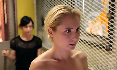 Busty dark flesh vixen watches how a skinny milky girl is dominated