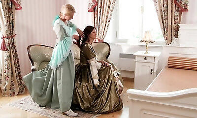 Three stunning lezzies in a castle get exhilarated and then they fuck on the throne chair