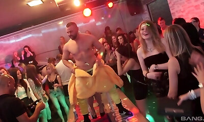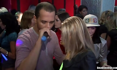 Promiscuous girls goes wild in the night club and take part in a crazy group intercourse