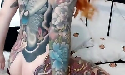 gorgeous tattooed redhead proudly shows pierced tits